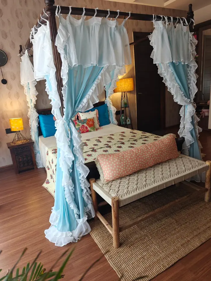 Transform your bedroom into a dreamy retreat with our New Fairy Poster Bed Ruffle Curtain. Available in enchanting blue and white shades, this sheer georgette curtain adds a touch of elegance and whimsy to any room. Designed for easy hanging, it effortlessly enhances your space while providing a soft, diffused light. Perfect for creating a cozy atmosphere, this curtain is available in multiple sizes to fit your needs, with prices starting at just 1449/- for 5×3.6 feet. Elevate your decor with this simple yet stylish ruffle-themed curtain and indulge in the fairy-tale ambiance it brings!